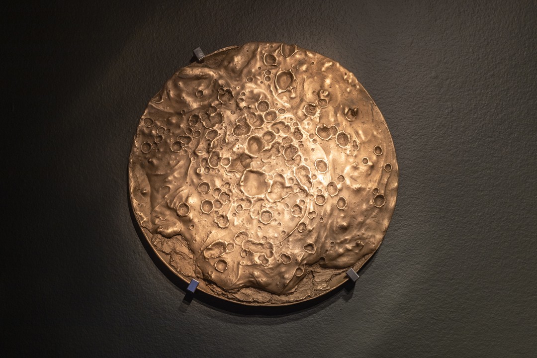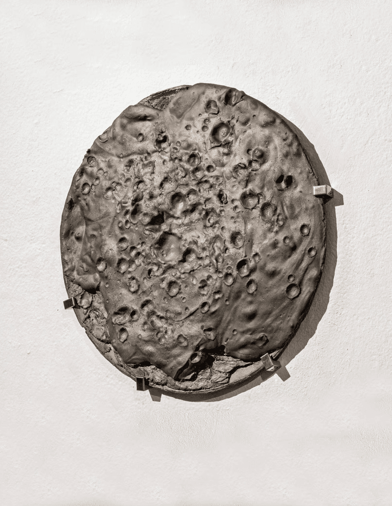 Lost-wax cast iron with custom stainless steel brackets 24 × 23 ¼ × 1 ¾ in. Circular iron casting from the Redbird system, bracket-mounted to the wall. Surface craters reference lunar cartography, grounding the system’s structural logic within cycles of erosion and endurance.
