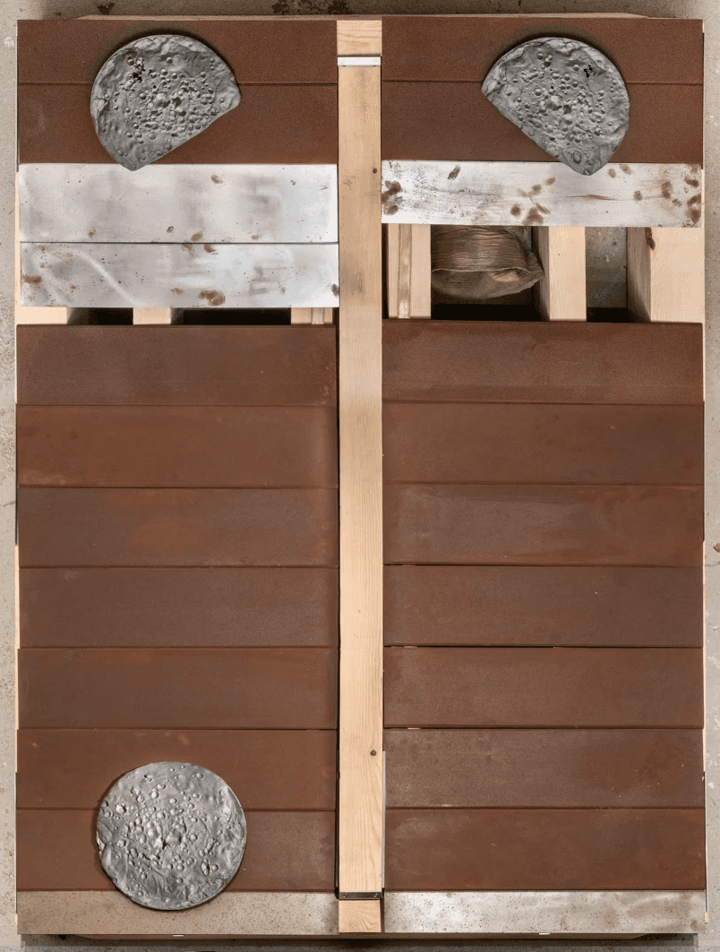 7.5 x 63.6 x 84 in. Sawn hemlock beam subframe; interior steel ribbing; custom steel corner and top brackets; under-panel stainless steel bracket system; poured urethane layer; conditioned cold-rolled steel panels; stainless steel top bracket system; lost-wax iron castings. Aerial view of Redbird’s structural layering, combining engineered joinery with cast iron lunar forms to register breath, weight, and environmental exposure as exhibited at Open Source Gallery (Brooklyn, NY). Each panel functions as part of an iterative structure designed for reassembly across sites.