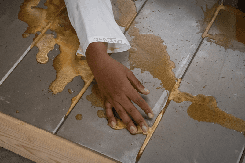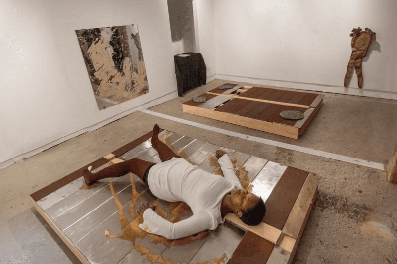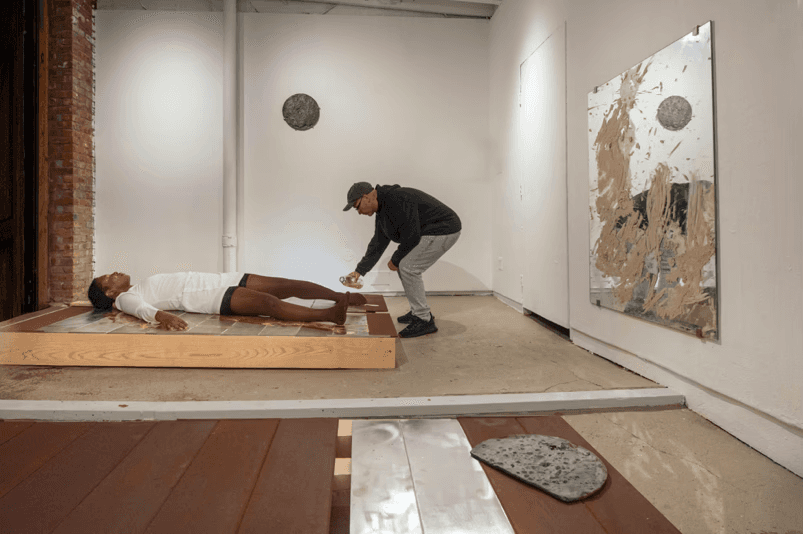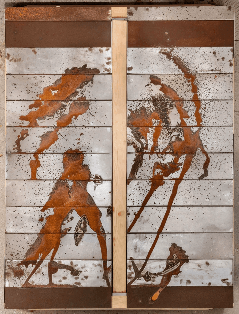 Performance activation in which the body engaged directly with the steel panels. Breath, contact, and applied agent initiated corrosion, completing the activation phase. Once marked, body traces remain embedded within the corrosion pattern, inscribing endurance and erosion into the structural system.