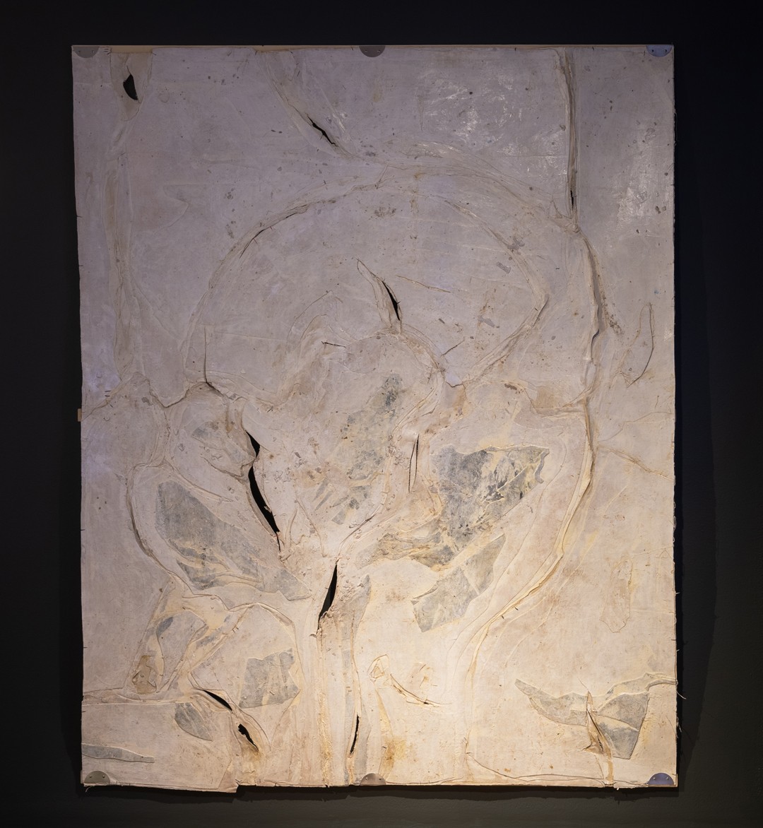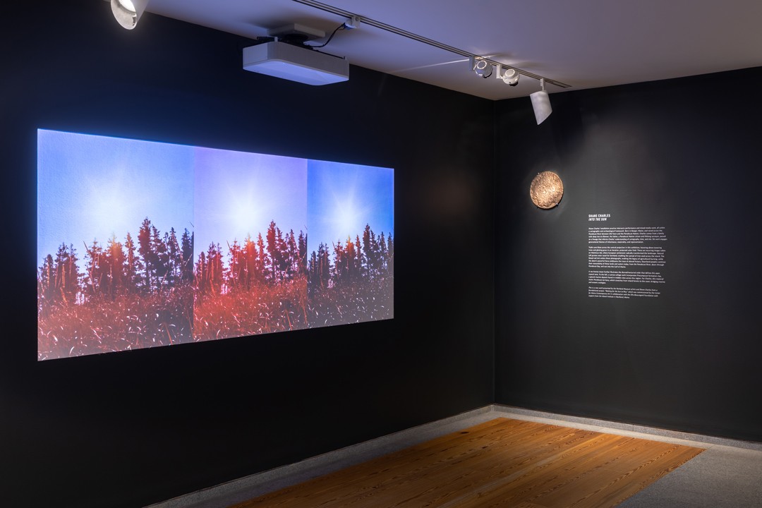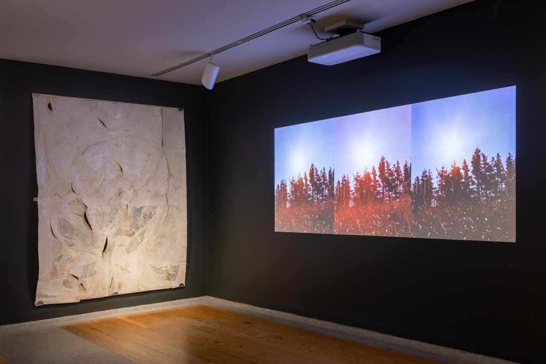 Video projection; canvas–clay collage; Bronze Moon Variable dimensions Panoramic installation view showing the spatial relationship between projection, canvas, and bronze casting. Installed at the Portland Museum of Art Photo: Courtesy of the Portland Museum of Art